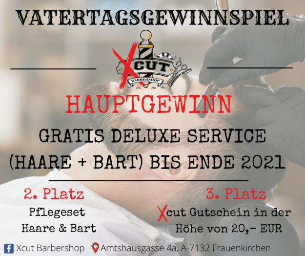 VATERTAGSGEWINNSPIEL – GIVEAWAY Zu gewinnen gibt es kostenlosen Rundum Service (all inklusive – Haare, Bart & Kosmetik) für den Rest des Jahres Exklusives Deluxe Programm für einen Gewinner Doch auch Platz 2 & 3 sollen nicht leer ausgehen! Pflegeset Haare & Bart im Gesamtwert von 50,- EURcut Barbershop Gutschein in der Höhe von 20,- EUR Teilnahmeregelungen:…